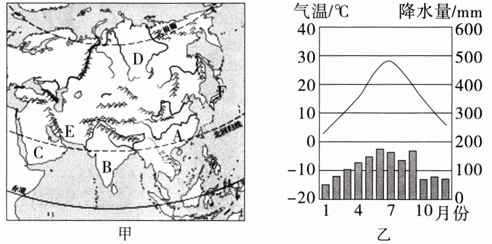5. 读亚洲地区图(甲图)和某地气候资料图(乙图),完成下列各题。