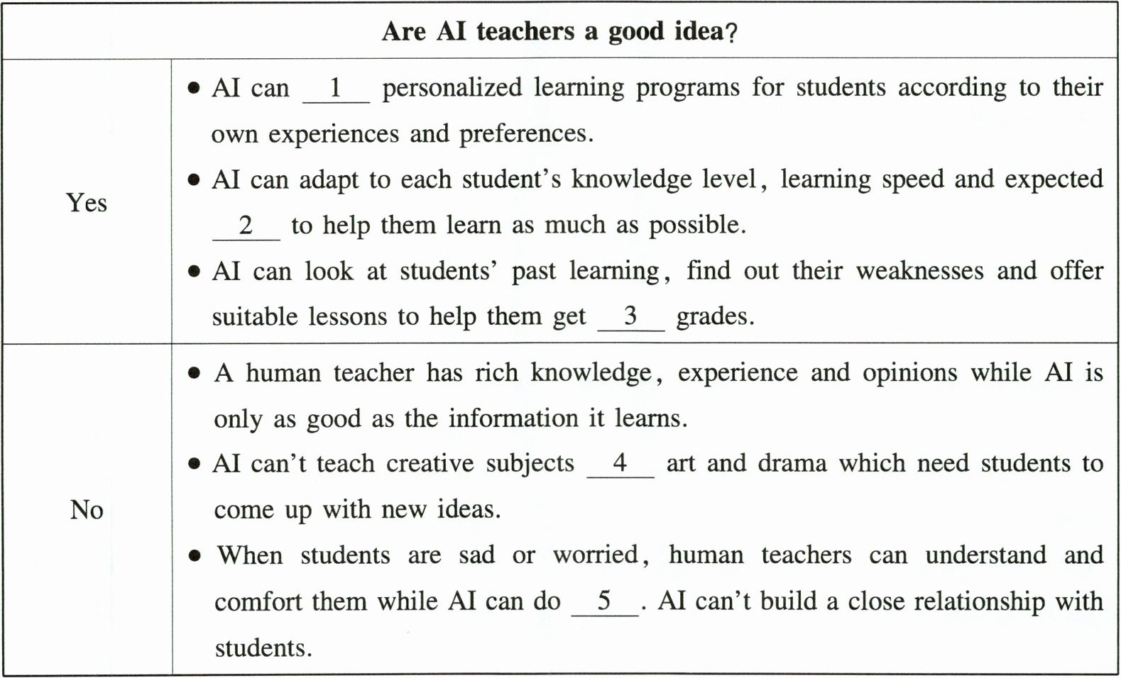 | No | • A human teacher has rich knowledge, experience and opinions while AI is only as good as the information it learns.• AI can't teach creative subjects 4 art and drama which need students to come up with new ideas.• When students are sad or worried, human teachers can understand and comfort them while AI can do 5. AI can't build a close relationship with students. |