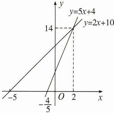 7. 在同一平面直角坐标系中,函数 $y = 2x + 10$ 与 $y = 5x + 4$ 的图象如图所示,请根据图象回答: