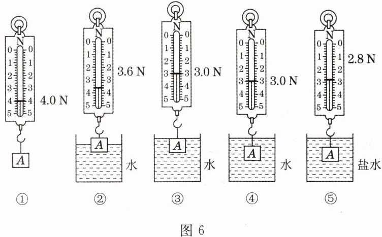 9. 在探究“影响浮力大小的因素”这一问题时,班级的“物理小博士”为同学们做了如图 6 所示的一系列实验。请你从中选出一些图,针对某一因素进行探究,并通过分析弹簧测力计的示数,说明你的探究结果。