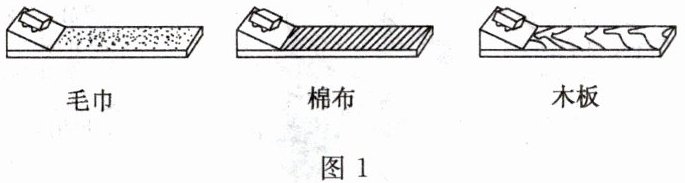 3. 如图 1 所示,给水平桌面铺上不同的物体(毛巾、棉布、木板),让小车自斜面(三个斜面相同)顶端从静止开始滑下,观察小车从同一高度滑下后,在不同表面运动的距离。