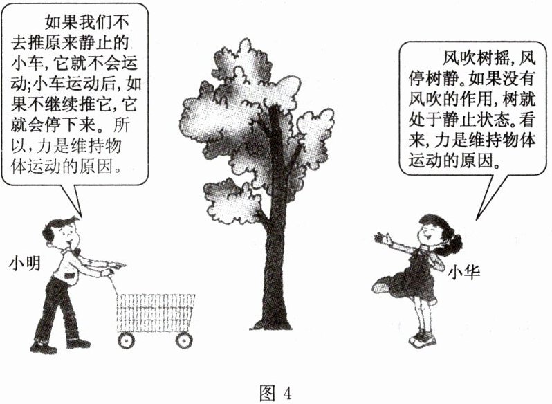 8. 在学习运动和力的关系时,小明和小华提出如图 4 所示的观点。请你利用身边的物品或实验器材设计一个实验,说明他们的观点是不是正确的。