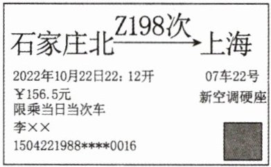 1. 李阿姨在网上购买了一张从石家庄北到上海的火车票,系统显示次日11:02到达,火车运行的时间是多长?