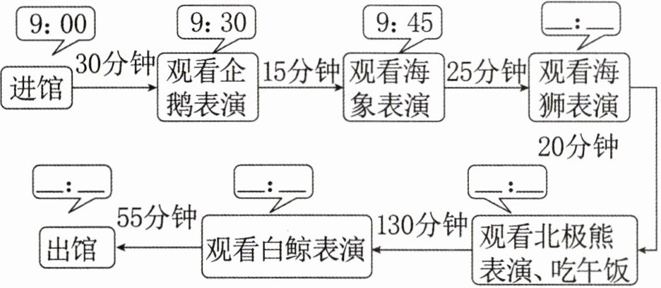 12时20分 + 130分 = 14时30分,即观看白鲸表演的开始时间是14:30;