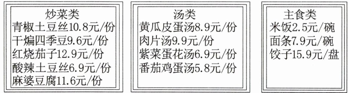 3. 下面是一个饭店的菜谱,典典和妈妈去吃饭,两个人带了50元,炒菜类、汤类和主食类都要点,他们可以怎样点餐?