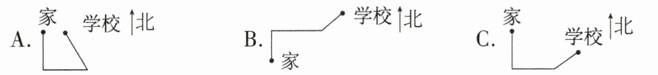 3. 小智从家到学校,先向北走一段路,然后向东走一段路,最后向东北走了一段路就到学校了。小智的行走路线是( )。