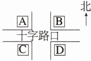 3. 如右图所示,B在十字路口的______角,C在十字路口的______角,B在A的______面,B在D的______面,______在A的东南面,______在C的东北面。