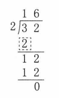 2. 一本字帖一共 32 页,小明每天练习 2 页,多少天能练习完? 竖式计算过程中,右图虚线框内的部分应该表示( )。