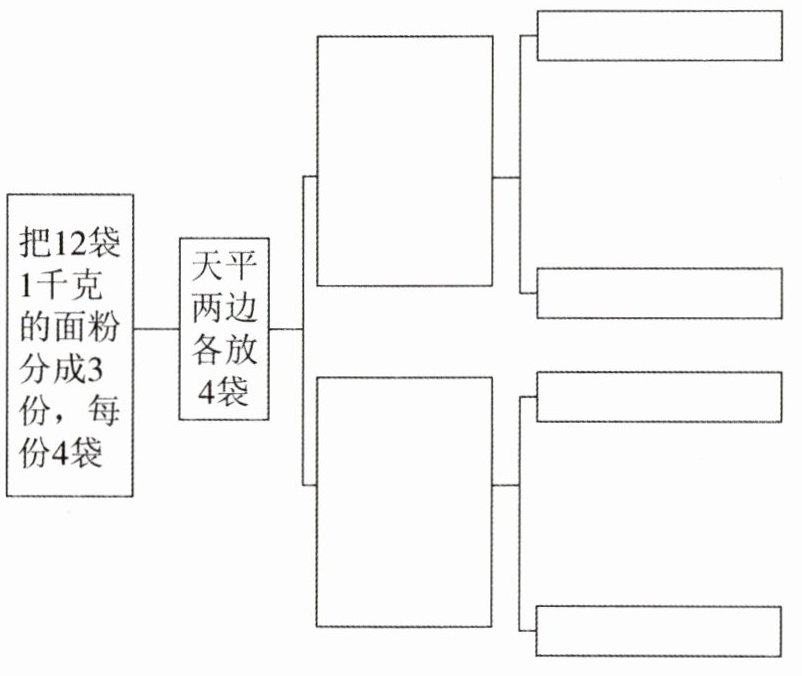 把$12$袋$1$千克的面粉分成$3$份,每份$4$袋,在天平两边各放$4$袋。