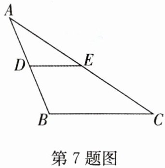 7. 一块等腰三角形空地$ABC$,如图,已知点$D$,$E分别是边AB$,$AC$的中点,量得$AC = 10$米,$AB = BC = 6$米,若用篱笆围成四边形$BCED$来放养小鸡,则需要篱笆