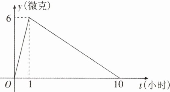 (1) 解:当 $0 \leq t \leq 1$ 时,设 $y = kt$,将 $(1, 6)$ 代入得 $6 = k × 1$,解得 $k = 6$,所以 $y = 6t$;当 $1 < t \leq 10$ 时,设 $y = mt + n$,将 $(1, 6)$,$(10, 0)$ 代入得 $\begin{cases}6 = m + n \\ 0 = 10m + n\end{cases}$,解得 $\begin{cases}m = -\frac{2}{3} \\ n = \frac{20}{3}\end{cases}$,所以 $y = -\frac{2}{3}t + \frac{20}{3}$。综上,$y = \begin{cases}6t(0 \leq t \leq 1) \\ -\frac{2}{3}t + \frac{20}{3}(1 < t \leq 10)\end{cases}$