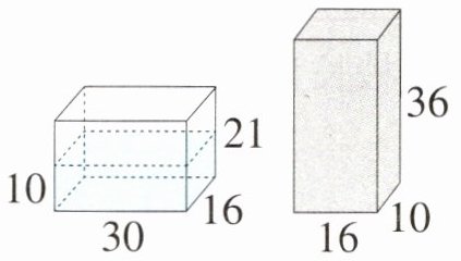 拓展训练营 如图,一个从里面量长、宽、高分别为30cm、16cm、21cm的长方体容器中水面高度是10cm,如果将一个长方体铁块(长、宽、高分别为16cm、10cm、36cm)竖直放入容器中(贴底面齐平),那么这个容器中的水会溢出吗? 如果不会溢出,那么容器中的水面高度是多少? 如果会溢出,那么会溢出多少立方厘米水?