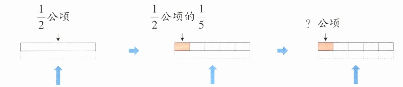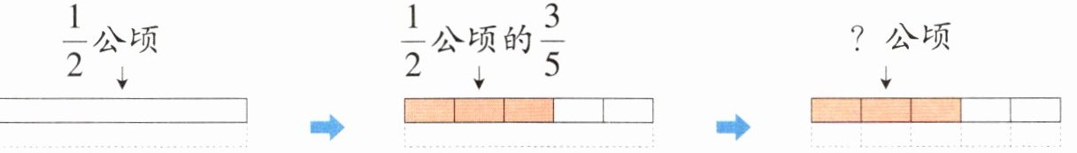 )份。(3)规范解答。$ \frac { 1 } { 2 } × \frac { 3 } { 5 } = \frac { 1 × 3 } { 2 × 5 } = \frac { 3 } { 1 0 } $$(公顷) 答:种玉米的面积是$$ \frac { 3 } { 1 0 } $$公顷。