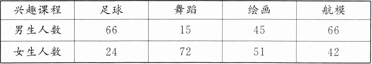3. 分别计算各课程总人数:足球$66 + 24 = 90$人;舞蹈$15 + 72 = 87$人;绘画$45 + 51 = 96$人;航模$66 + 42 = 108$人。因为$108>96>90>87$,航模总人数最多。