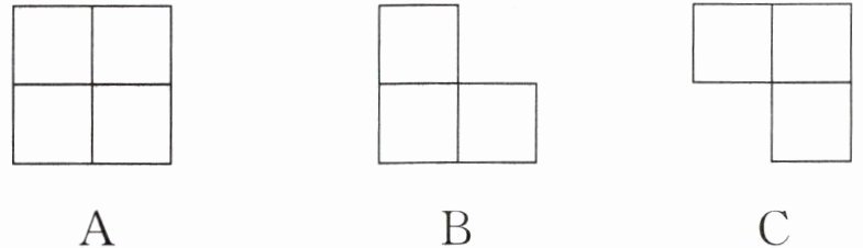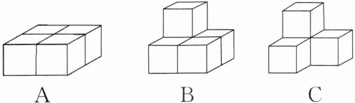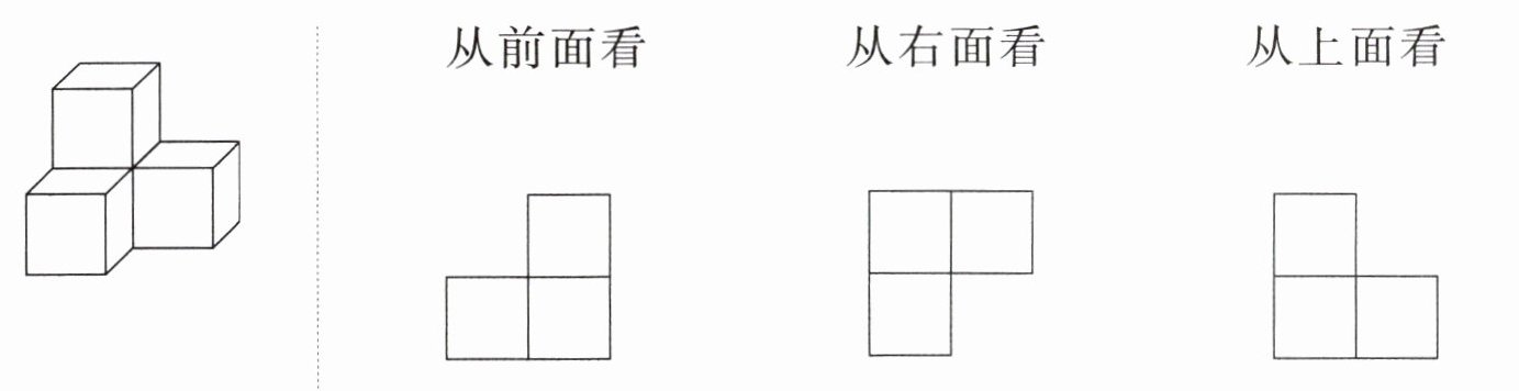 【解析】:根据立体图形的特征,从前面看有两层,下面一层两个,上面一层一个靠右;从右面看有两层,下面一层两个,上面一层一个靠左;从上面看有两层,上面一层一个靠左,下面一层两个。