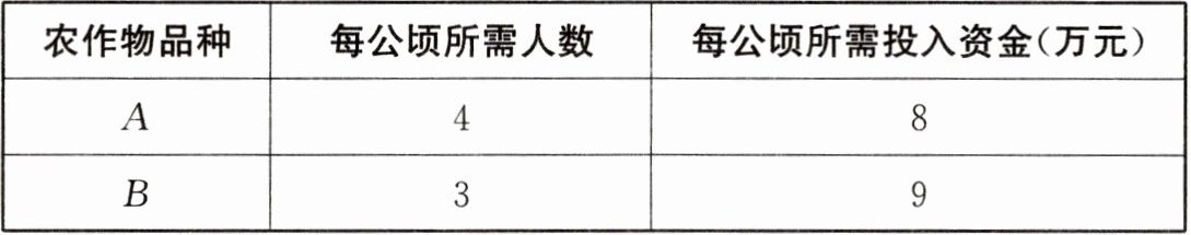 9. 乡村振兴战略实施以来,很多外出人员返乡创业.某村有部分返乡青年承包了一些田地,采用新技术种植A、B两种农作物.种植这两种农作物每公顷所需人数和投入资金如表: