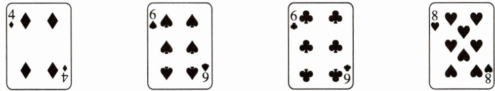 同学们,你们玩过“24 点”游戏吗?就是用扑克牌中的 A~10(A 代表 1)共 40 张牌,任意抽 4 张,通过加、减、乘、除的运算(可以用括号),将牌面上的 4 个数凑成 24。比如:用下面 4 张纸牌算“24 点”,一种算法是$ (6 + 6)÷4×8 $,你能再想出 4 种以上的算法吗?