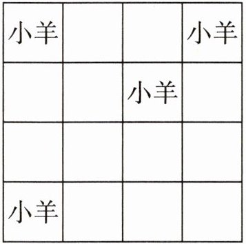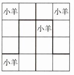 2. 羊妈妈家门前有一块空地(如下图),她把这块地分成大小、形状完全相同的四块,给 4 只小羊各盖一间房。你知道她是怎么分的吗?(不要改动小羊的位置,分一分)