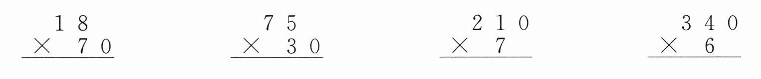 乘数末尾有$0$的乘法,可以先把$0$前面的数相乘,然后看乘数末尾一共有几个$0$,就在乘得的积的末尾添上几个$0$。