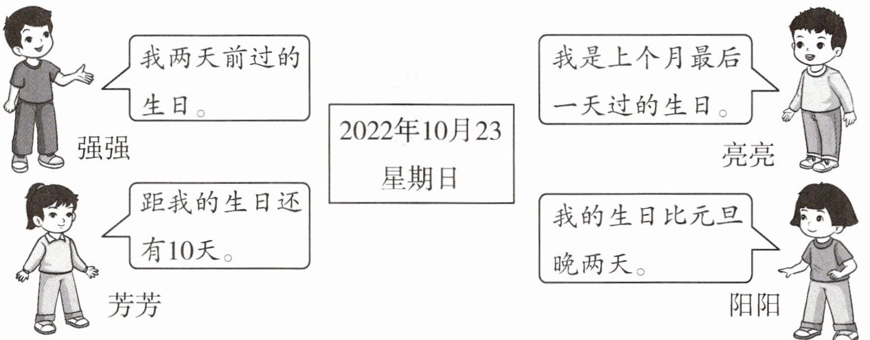 强强的生日是( )月( )日;亮亮的生日是( )月( )日;芳芳的生日是( )月( )日;阳阳的生日是( )月( )日。