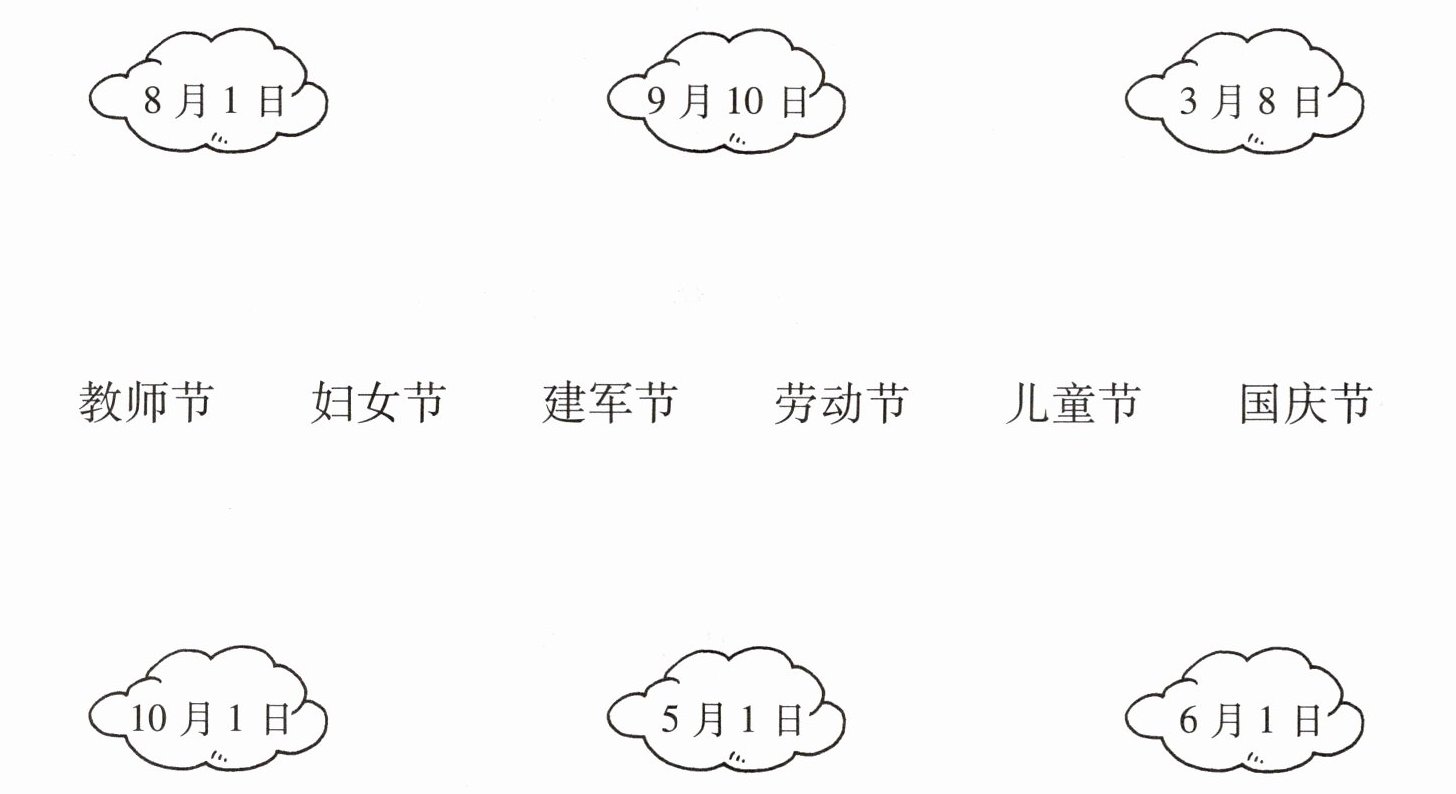 教师节—9月10日 妇女节—3月8日 建军节—8月1日 劳动节—5月1日 儿童节—6月1日 国庆节—10月1日