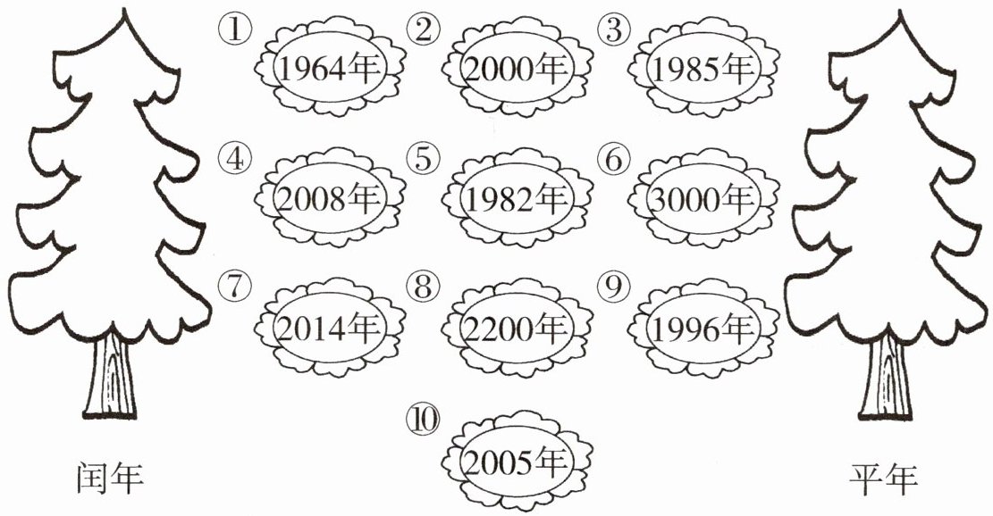 三、把下列属于闰年年份的序号填在第1棵树里,属于平年年份的序号填在第2棵树里。