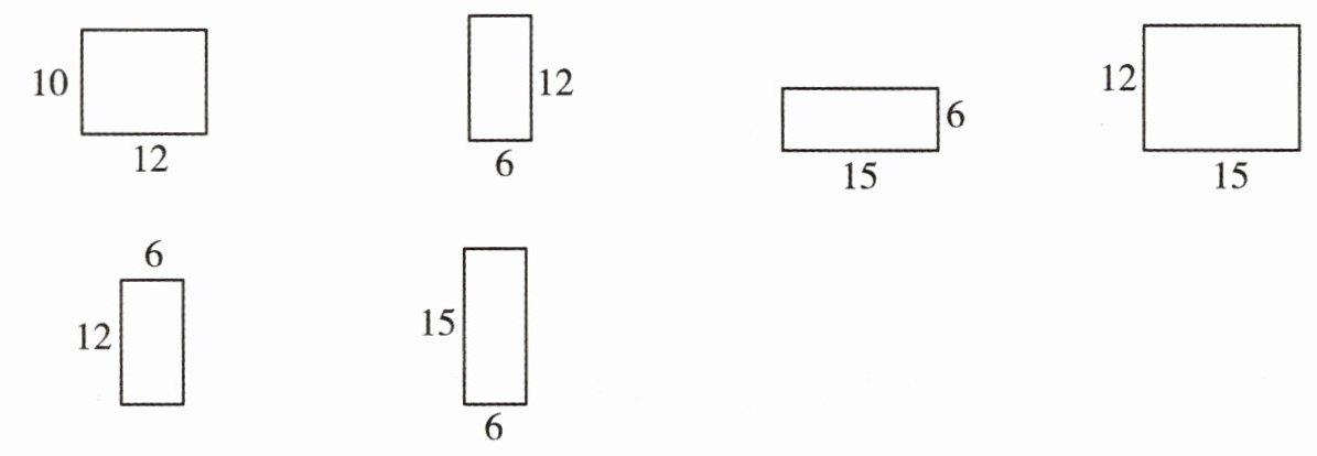 三、下面是6张长方形卡纸,请你从中找出5张拼成一个无盖的长方体,并画出这个长方体,最后求容积。(图中数据单位为厘米,厚度忽略不计)