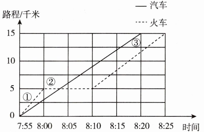 三、下面是一辆汽车与一列火车的行程统计图,根据统计图回答问题。