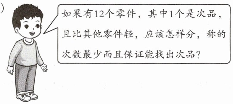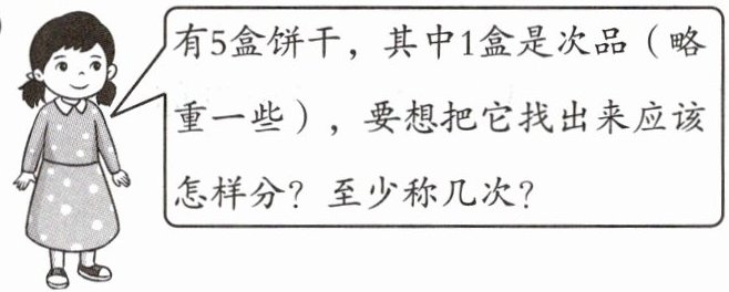 在生活中我们常常会遇到这样的情况,在一些外观看似相同的物品中,混着一个质量轻一点或重一点的物品,需要我们想办法把它找出来。通过本章知识的学习,解决这类问题时,你有什么方法和窍门吗?试着写出来。