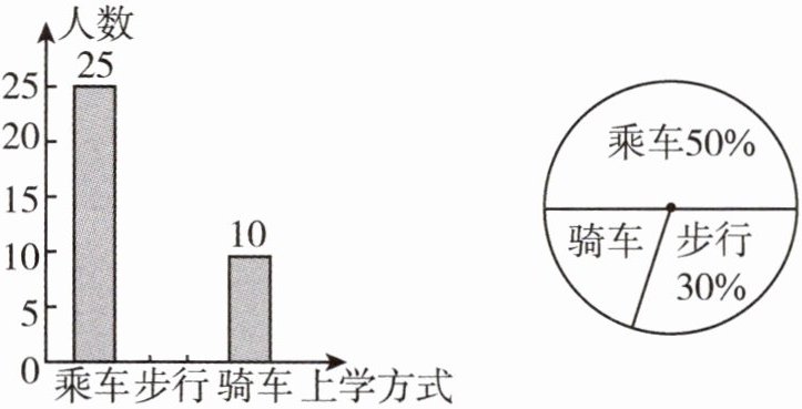6. 下面两图是某班全体学生上学时,乘车、步行、骑车的人数分布条形图和扇形图(两图均不完整),则下列结论中错误的是 (