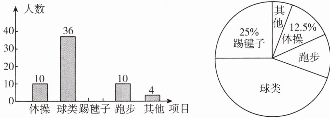 为了解全校 1800 名学生对学校设置的体操、球类、踢毽子、跑步等课外体育活动项目的喜爱情况,在全校范围内随机抽取了若干名学生,对他们最喜爱的体育项目(每人只能选一项)进行了问卷调查,将数据进行统计并绘制成了如下图所示的条形图和扇形图(均不完整).