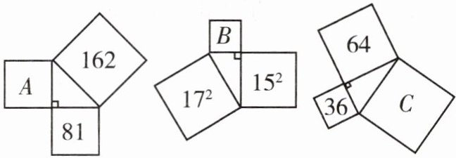 综上,正方形$A$的面积为$\boldsymbol{81}$,正方形$B$的面积为$\boldsymbol{64}$,正方形$C$的面积为$\boldsymbol{100}$。