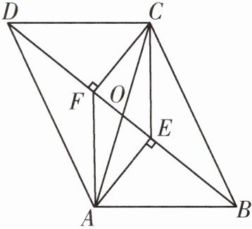 3. 如右图,在四边形 $ABCD$ 中,$AB = CD$,对角线 $AC,BD$ 相交于点 $O,AE\perp BD$ 于点 $E,CF\perp BD$ 于点 $F$,连接 $AF,CE$,若 $DE = BF$,则有下列结论:① $CF = AE$;② $OE = OF$;③四边形 $ABCD$ 是平行四边形;④图中共有四对全等三角形. 其中正确结论是______