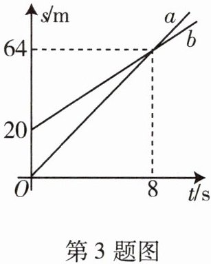 3. 小明、小强两人进行百米赛跑,小明比小强跑得快,如果两人同时跑,小明肯定赢,现在小明让小强先跑若干米,如图中的射线 a,b 分别表示两人跑的路程 s(单位:m)与时间 t(单位:s)的关系.根据图象判断:小明的速度比小强的速度快(