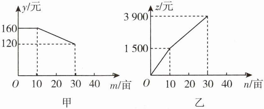 某农庄计划在 30 亩(1 亩合 666.7 平方米)空地上全部种植蔬菜和水果,菜农小张和果农小李分别承包了种植蔬菜和水果的任务. 小张种植每亩蔬菜的工资 y(单位:元)与种植面积 m(单位:亩)之间的函数关系如图甲所示,小李种植水果所得报酬 z(单位:元)与种植面积 n(单位:亩)之间的函数关系如图乙所示.
