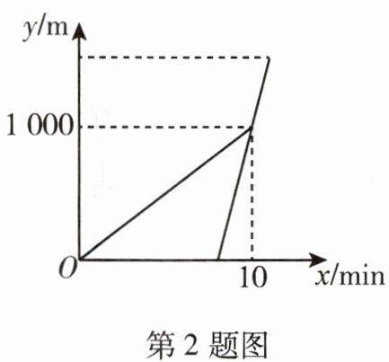 2. 甲、乙两人从公司去健身房,甲先步行前往,几分钟后乙乘出租车追赶,出租车的速度是甲步行速度的 5 倍,乙追上甲后,立刻带上甲一同前往,结果甲比预计早到 4 min. 他们距公司的路程 y(单位:m)与时间 x(单位:min)间的函数关系如图所示,则下列结论中正确的个数有 (