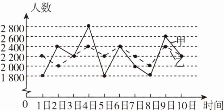 4. 某市甲、乙两景点2023年5月1日—5月10日每天接待游客的人数如图所示,甲、乙两景点日接待游客人数的方差大小关系为$s^{2}_{甲}$______