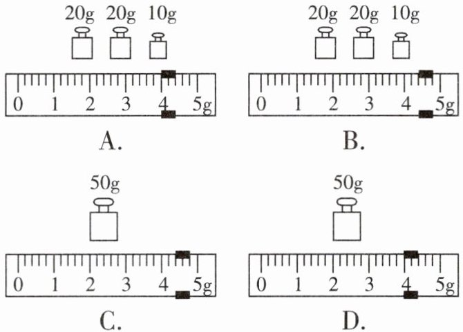 11. 在测量金属块质量的实验中,当天平平衡时,王涛同学正确读得金属块的质量为54.4g,则放在右盘中的砝码和标尺上游码的位置正确且操作规范的是 (