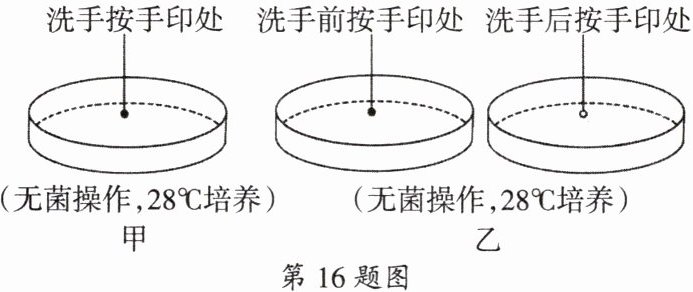 16. 洗手看似简单,殊不知其中大有学问。某校学生兴趣小组的两位同学利用盛有无菌培养基的培养装置,分别设计了洗手能减少手上细菌数量的验证试验: