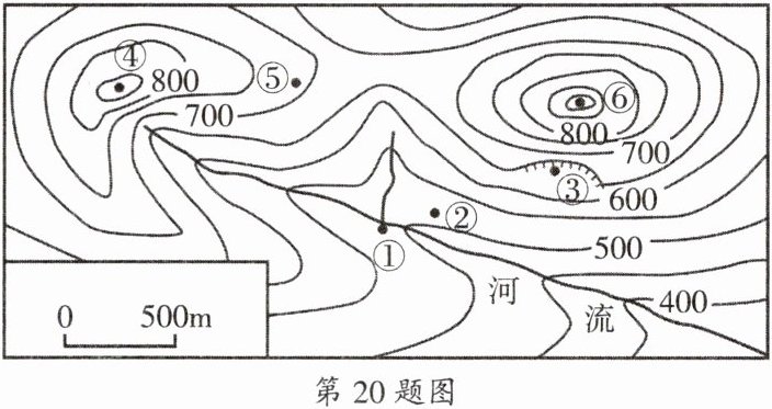20. 某科学兴趣小组的同学们在户外活动专家的陪同和指导下,开展了一系列野外综合实践活动。如图所示为他们出发前搜集到的目的地的等高线地形图。