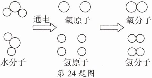24. 如图是电解水(水$\xrightarrow{通电}$氢气+氧气)的模型图,请根据图填空。