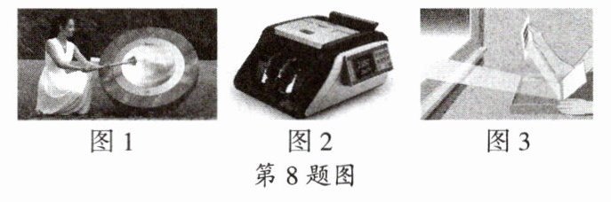 进行验钞;如图3所示,在水槽中斜插入一块平面镜,让太阳光斜射到平面镜上,适当调整平面镜的位置和角度,可以在墙壁上看到红、橙、黄、绿、蓝、靛、紫等色光组成的彩色光带,这是光的色散
