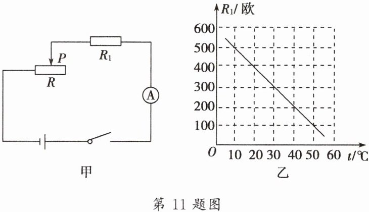 11. 随着社会的发展和科技的进步,电路元件在各行各业得到广泛的应用,热敏电阻就是其中之一。热敏电阻的阻值会随温度的变化而变化。图甲是用热敏电阻测量环境温度的电路,电路中电流表的量程为$0\sim 0.02$安,滑动变阻器$R$的铭牌上标有“$150\Omega \;\;0.3A$”字样,$R_{1}$为热敏电阻,其阻值随环境温度变化关系如图乙所示,电源电压保持不变。请回答下列问题: