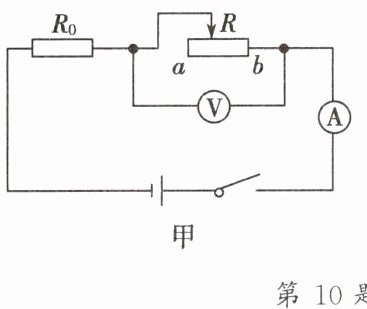 10. 如图甲所示,电源电压恒定,$R_{0}$为定值电阻。将滑动变阻器的滑片从$a端滑到b$端的过程中,电压表示数$U与电流表示数I$之间的关系图像如图乙所示。求: