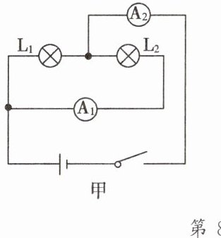 8. 如图甲所示电路,开关闭合后两电流表的指针指在同一位置,两表的示数均如图乙所示,则灯$L_{1}$的电流为
