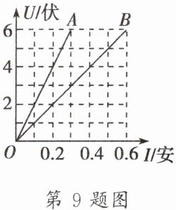 9. 如图是$A$、$B两定值电阻的U-I$图像,由图像中信息可知,通过$A导体的电流为0.2$安时,$A$导体两端电压为