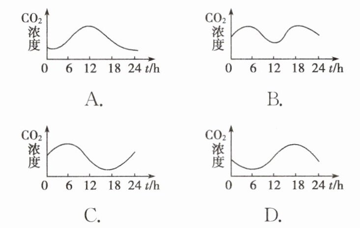 6. 某生物兴趣小组的同学在玻璃温室里进行植物栽培实验,并在一晴天夜晚从零点开始对室内空气中的二氧化碳浓度进行了24h测定,下列曲线能正确表示测定结果的是