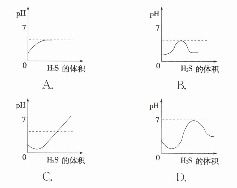 4. 二氧化硫是有刺激性气味的有毒气体,其水溶液叫亚硫酸(${H_{2}SO_{3}}$);硫化氢(${H_{2}S}$)是一种具有剧毒的臭鸡蛋气味的气体,其水溶液叫氢硫酸(${H_{2}S}$)。又知相同条件下${H_{2}S}的酸性小于{H_{2}SO_{3}}$,现在室温下向饱和${H_{2}SO_{3}}溶液通入过量{H_{2}S}$气体,反应方程式为:${2H_{2}S + H_{2}SO_{3} \xlongequal{} 3S \downarrow + 3H_{2}O}$,则溶液的pH随通入${H_{2}S}$体积的变化曲线示意图正确的是(