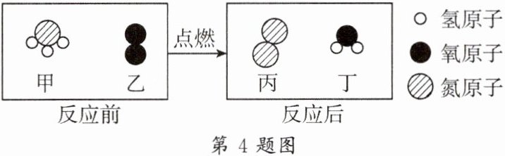 4. 为减少温室气体排放,人们积极寻找不含碳的燃料,其中$NH_{3}$燃烧前后分子种类变化的微观示意图如图。下列说法正确的是 (