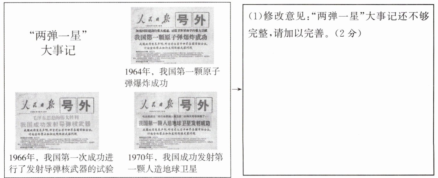 (1)增加:1967年,我国第一颗氢弹爆炸成功。(2分)